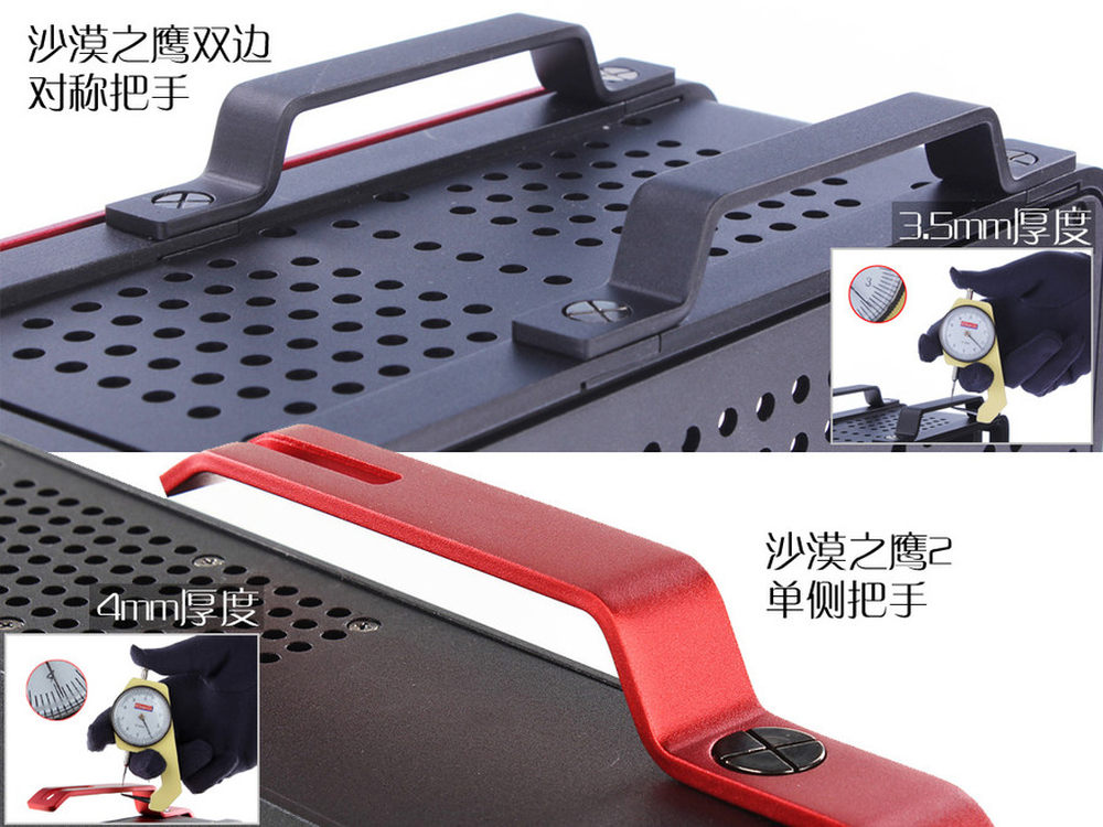 一代沙漠之鹰的侧板让人印象深刻,一面是惹眼的红色阳极装饰板,而另一侧则是完全为散热考量的大面积开孔,这一面的侧板会让机箱造型大打折扣。全新二代沙漠之鹰采用分区散热,减少开孔面积便让机箱有更多的空间可以进行美化,因此才能达成装饰与功能并存。