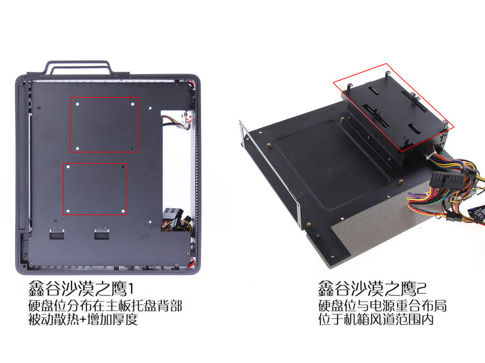 刚刚的图片中我们没有展示沙漠之鹰1代硬盘位,原因是它分布于机箱主板托盘背面,这种布局显然会小幅增加机箱宽度。而沙漠之鹰2巧妙的将电源与硬盘进行垂直布局,两块硬盘位尺寸与电源极为相近,而且高度方面也贴合装好散热器的主板,对电源和硬盘空间的布局非常完美。9/11