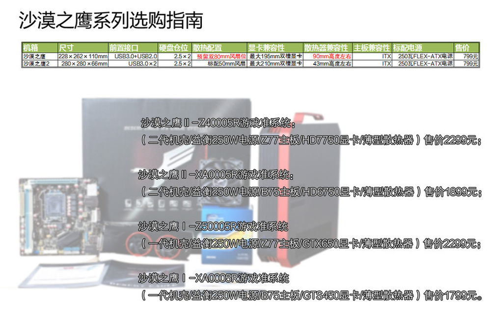 说了这么多沙漠之鹰2代的进化,其实1代产品也有难以替代的优势,在散热器兼容性方面,如果使用第三方方案沙漠之鹰1代的选择更加宽泛,加装12厘米风扇的S17、66mm模式的猫头鹰L12都是压制发热不错的选择。当然如今鑫谷为沙漠之鹰2量身定做了一款3热管超薄散热器、高端Z77芯片组ITX主板以及半高顶级水准的7750LP显卡,它们减少了各位因为机箱空间限制搭配硬件的烦恼,在各种体验都追求简洁化的今天,沙漠之鹰为我们带来了全新的DIY模式。