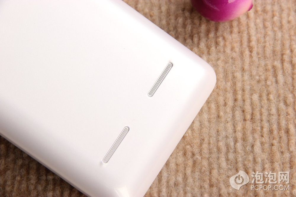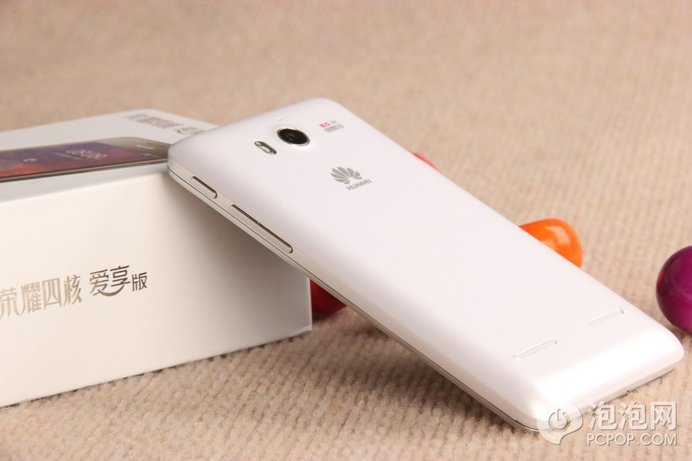 华为荣耀四核爱享纯真版手机机身背面采用白色塑料材质。5/13