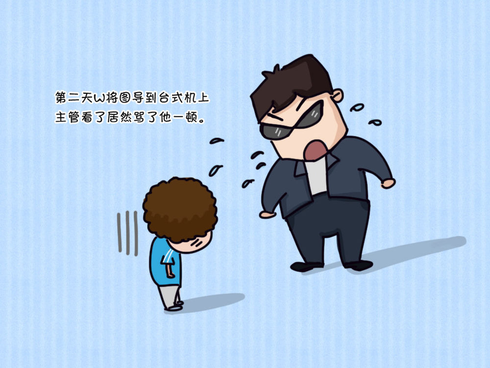 第二天W兴致勃勃地将昨天完成的方案通过桌面显示器展示给主管浏览,结果被大骂一顿。5/11