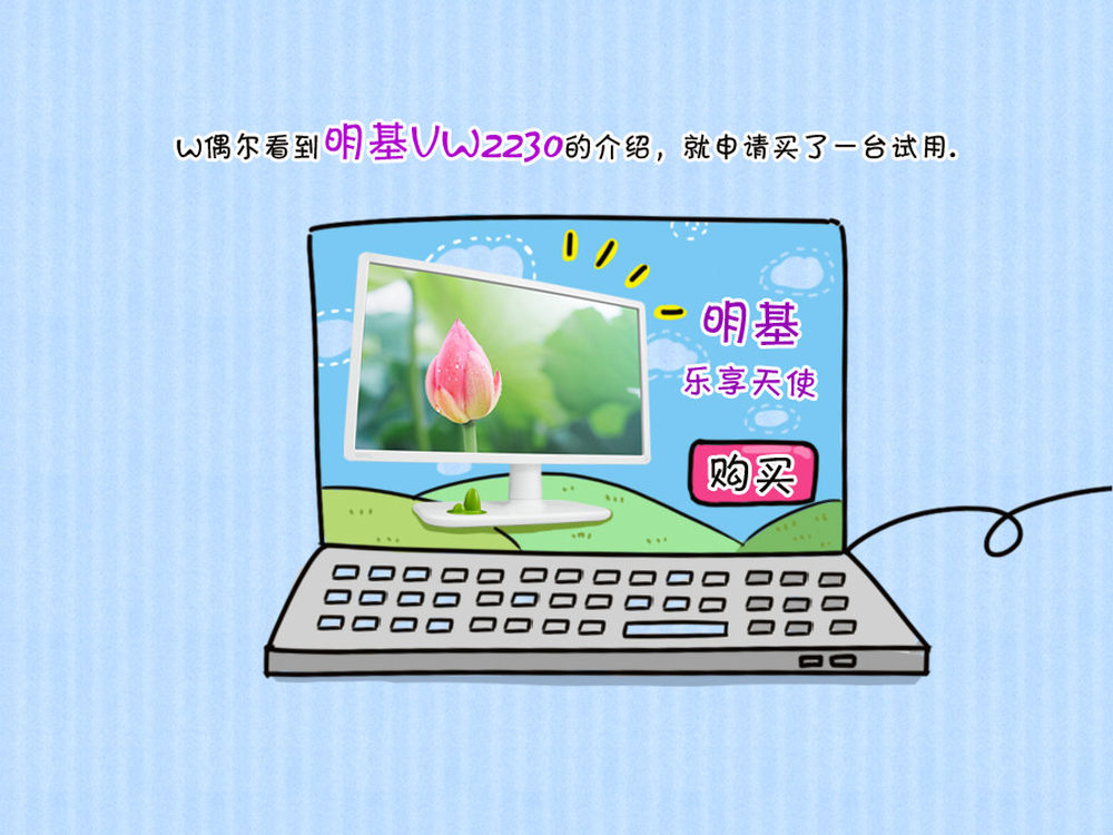 偶然的机会,W接触到了明基新一代天使178--VW2230显示器,其时尚简洁的外观深深的吸引了他,更重要的是产品提供了M-Book模式,完美支持Mac OS系统,于是就申请购买了一台使用。7/11