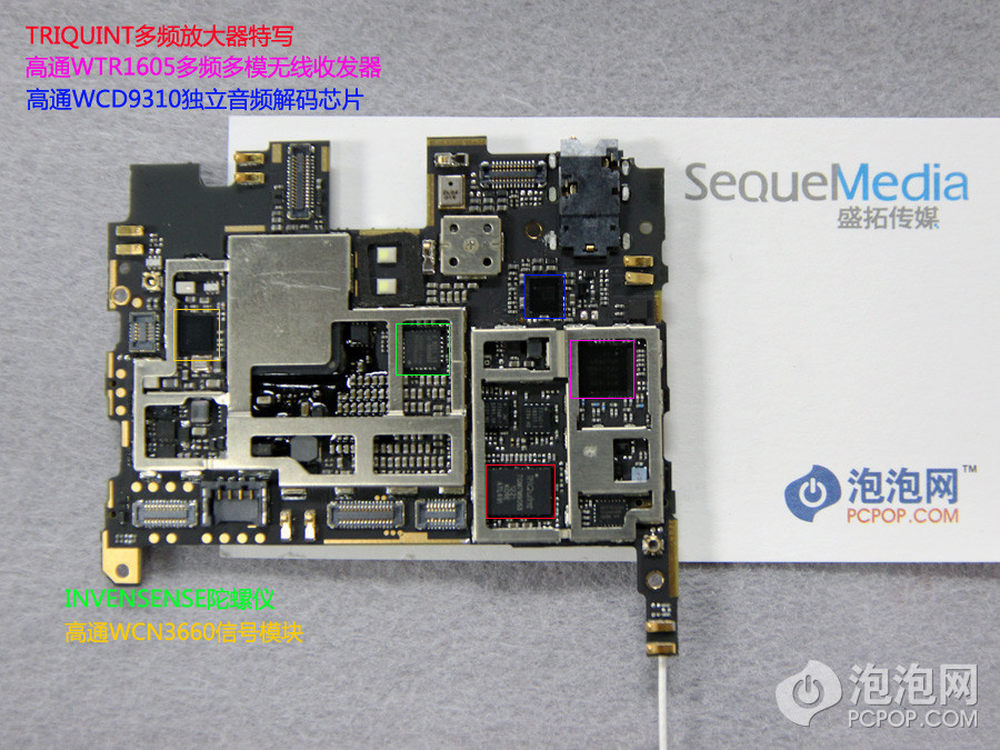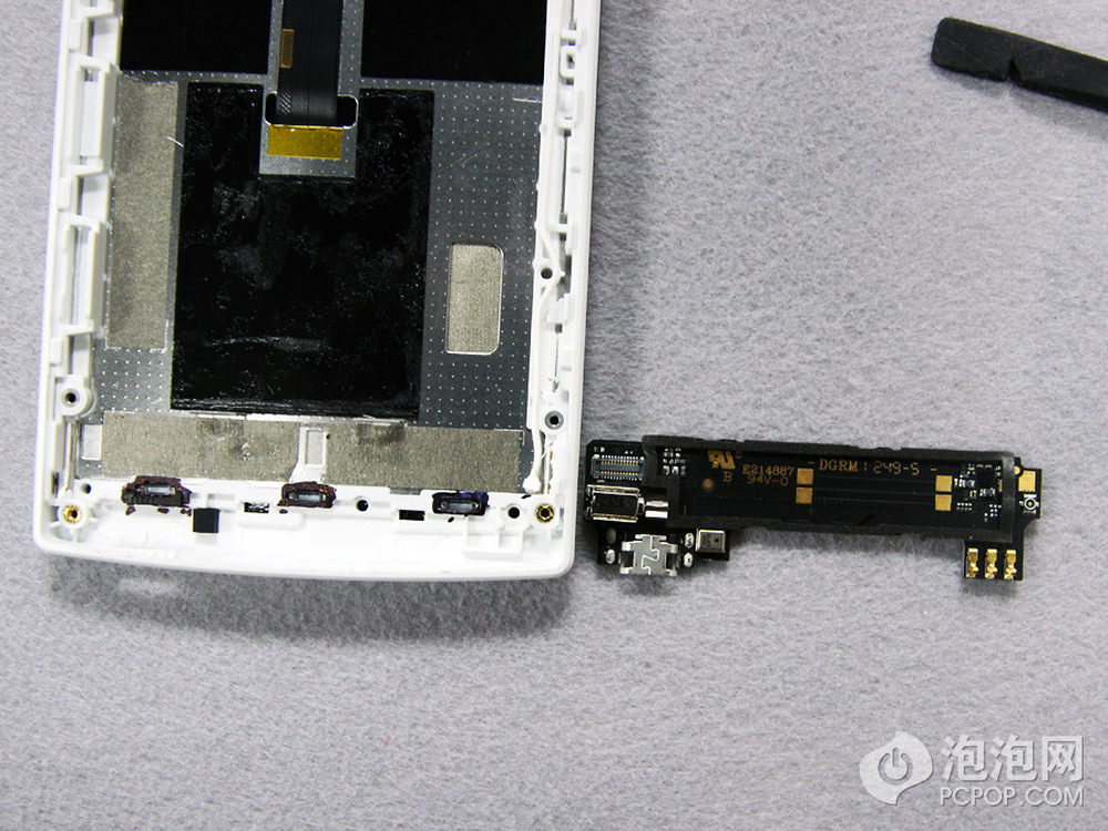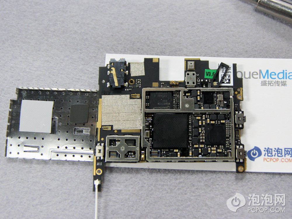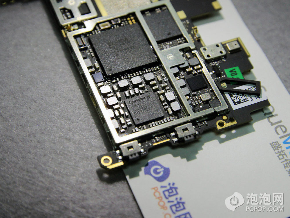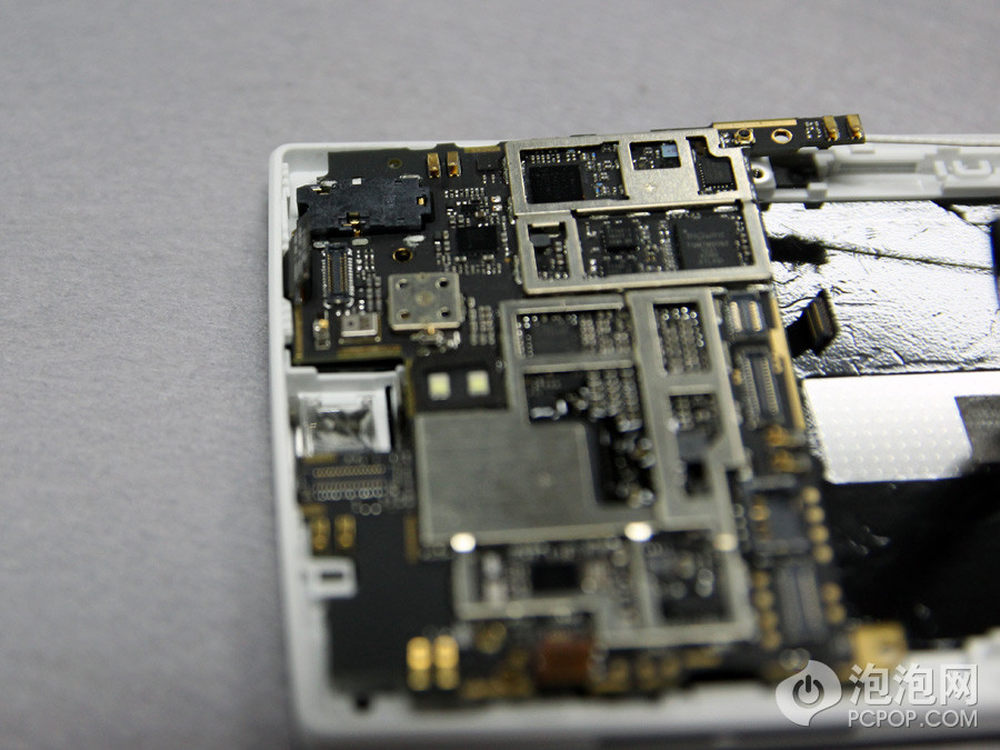 手机靠上就是主要芯片的位置了,黑色的覆盖物为散热层,贴在芯片上,可以撕下来。5/24