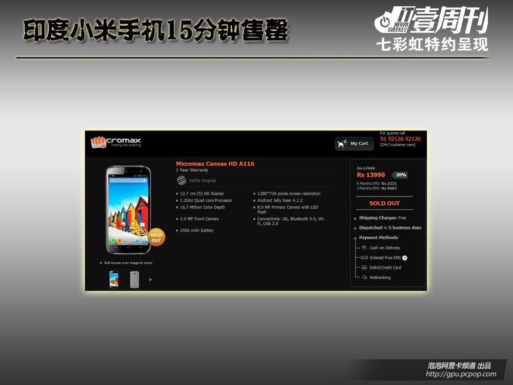 Micromax推出的A116 Canvas HD是一部基于Android系统的四核廉价智能手机,该机于1月底发布,今天正式通过电商网站SnapDeal开售,结果在15分钟内宣告售罄。Micromax A116 Canvas HD采用5英寸IPS屏幕,分辨率为1280?720,1.2GHz四核联发科处理器,800万像素后置摄像头,200万像素前置摄像头,1GB RAM,4GB ROM,支持通过microSD卡扩充至32GB,双SIM卡,2100毫安时电池,售价为13999印度卢比(约合人民币1600元)。5/12