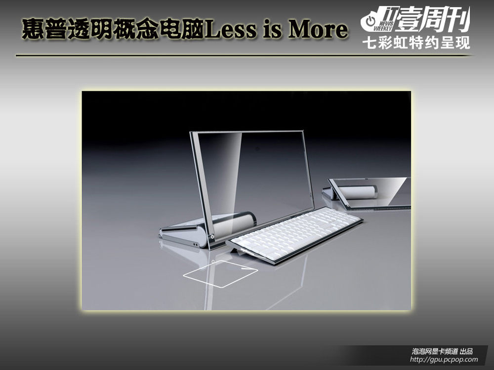 手机、平板都运用了透明技术,电脑也不例外,注意,不是笔记本,是电脑哦。这是一款惠普的概念电脑,它提倡的是 Less is More (少即是多)的理念设计。电脑配置了全透明设计的19寸电脑显示屏幕,屏幕采用的是LIM材料,主机箱采用的是字典的样式,非常有现代感。此外这款电脑还搭配了无线键盘,整体效果令人惊叹。更为先进的是其触摸板是从键盘侧面激光投影出来的,这样操作这台电脑就可以不用鼠标了,非常酷的创意设计。7/12