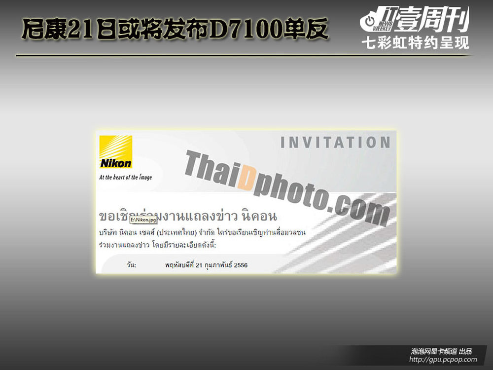 尼康(泰国)已经向媒体发出发布会邀请,宣布将于2月21日召开新品发布会。此外,尼康已经在多个国家安排了发布会,所以看起来这次会有比较重要的新品亮相。 鉴于此前在CES和CP 上尼康已经发布过无反和便携机型,下周最有可能发布的就是D7000后续机型(暂称D7100)。