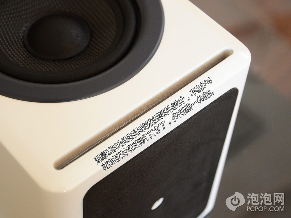 采用条形前置倒相孔的设计是声擎一贯的风格,P4音响的倒相孔位置被挪到底部而已,起到的效果是一样的。8/17