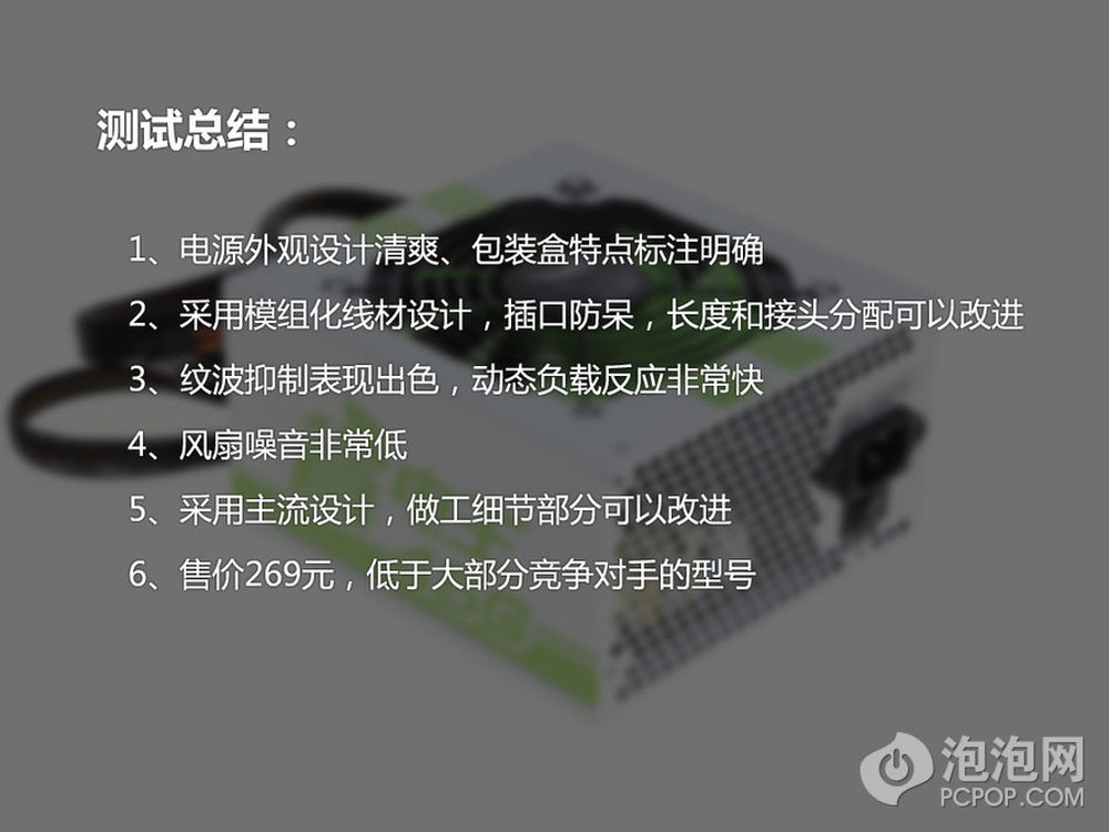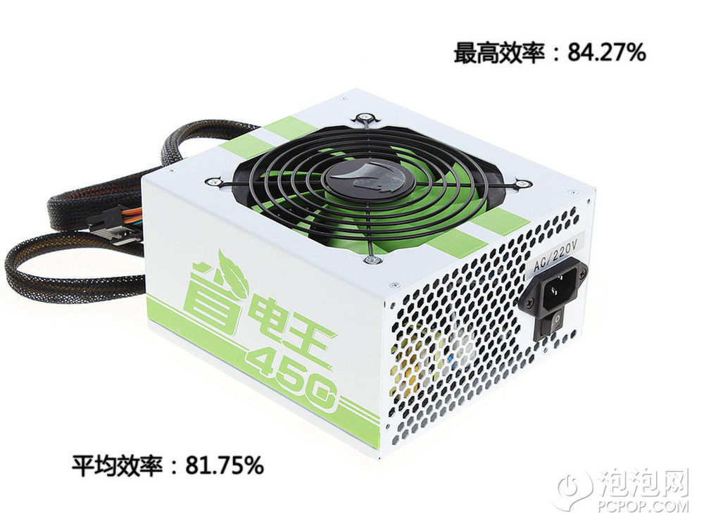 电源外观喷漆清爽,省电的特点基本都会用到绿色,这个电源也更适合搭配白色系机箱。电源最高转换效率85.27%%,不过450瓦满载下的效率跌落到80%%以下了。3/21