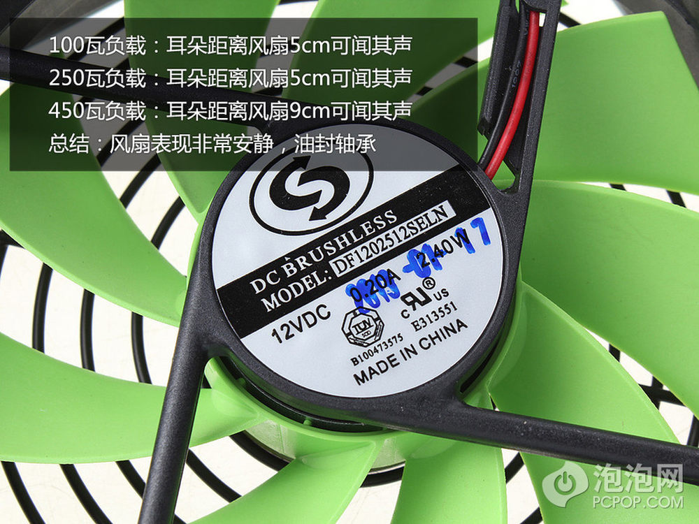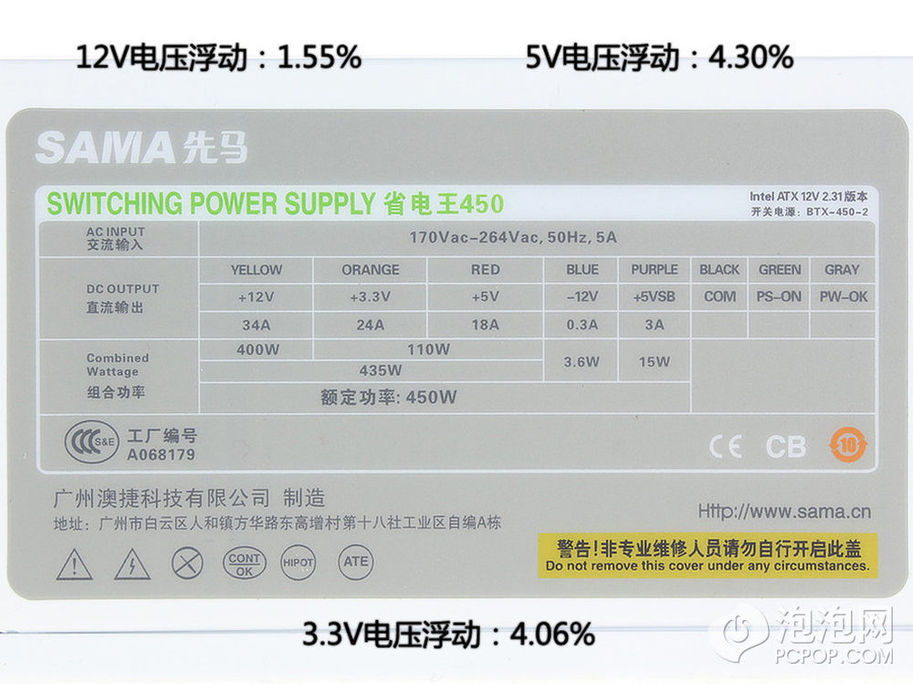 电源额定功率450瓦,名称和型号中带有的数字与之一致,值得提倡。12V输出能力标注34A,合408瓦,比例很高。5Vsb的输出也较绝大部分450瓦电源要高,达到了3A,电源拥有3C认证。电压浮动值也一并标出,3.3V和5V的浮动比12V的大很多。5/21