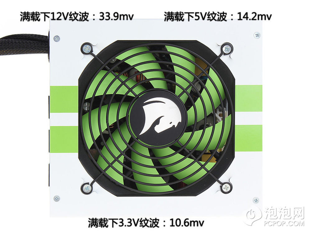 电源风扇一侧看视觉效果也很好,如果换成黄黑搭配就是跑车系,如果红黑搭配就是赛道系。绿色风扇配黑色风扇罩,内部PCB涂黑漆,正好搭配在一起。纹波测试结果很不错,各路都很低。7/21