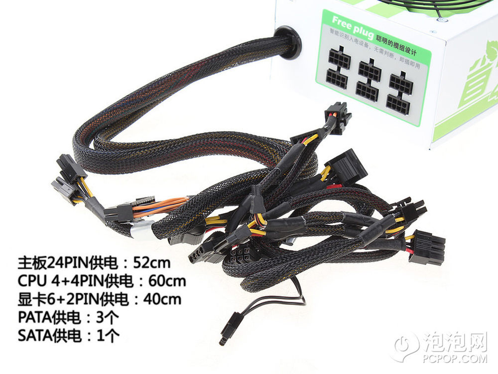 这个450瓦电源的线材采用了模组化设计,可以看到一共有6个模组化插头,他们都是一样的设计,不论插哪个孔都可以,正所谓先马的Free Plug。不过450瓦版本送的模组化线材只有显卡一根、PATA一根、SATA一根。装机时并不会比非模组化电源少用什么线。建议SATA和PATA接头合并在一根线,赠送2条。显卡供电只提供一个6 2PIN,不如增加一个6PIN,因为目前也没有什么显卡只有一个6 2PIN接头。而且显卡供电线材长度短,大机箱里可能会不够用。10/21