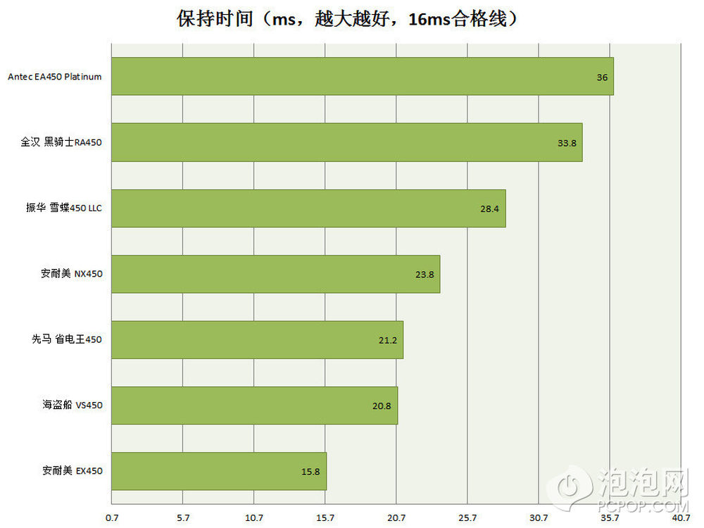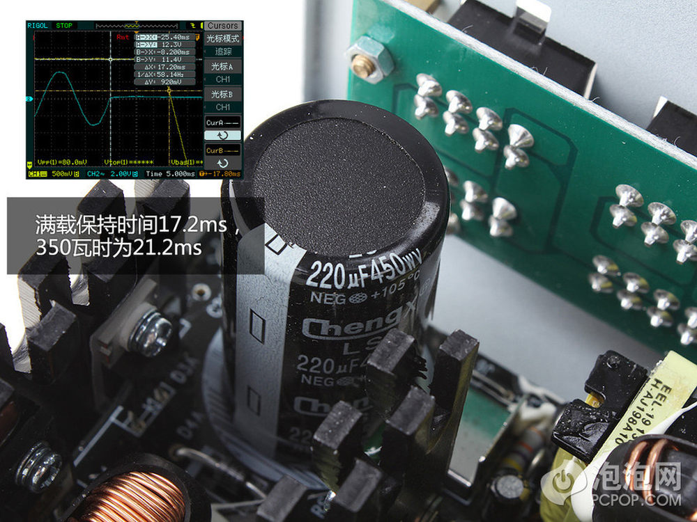 我截图中出现了错误,350瓦下的保持时间没有截取到,不过数字是21.2ms。这个表现对入门级电源来说非常不错。14/21