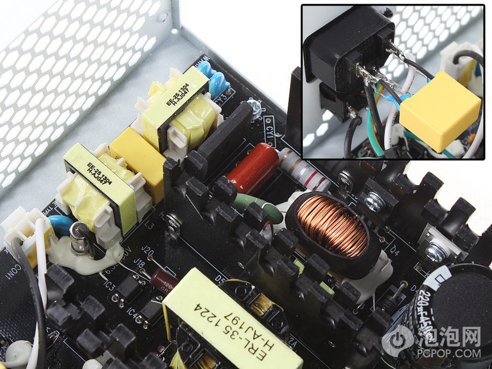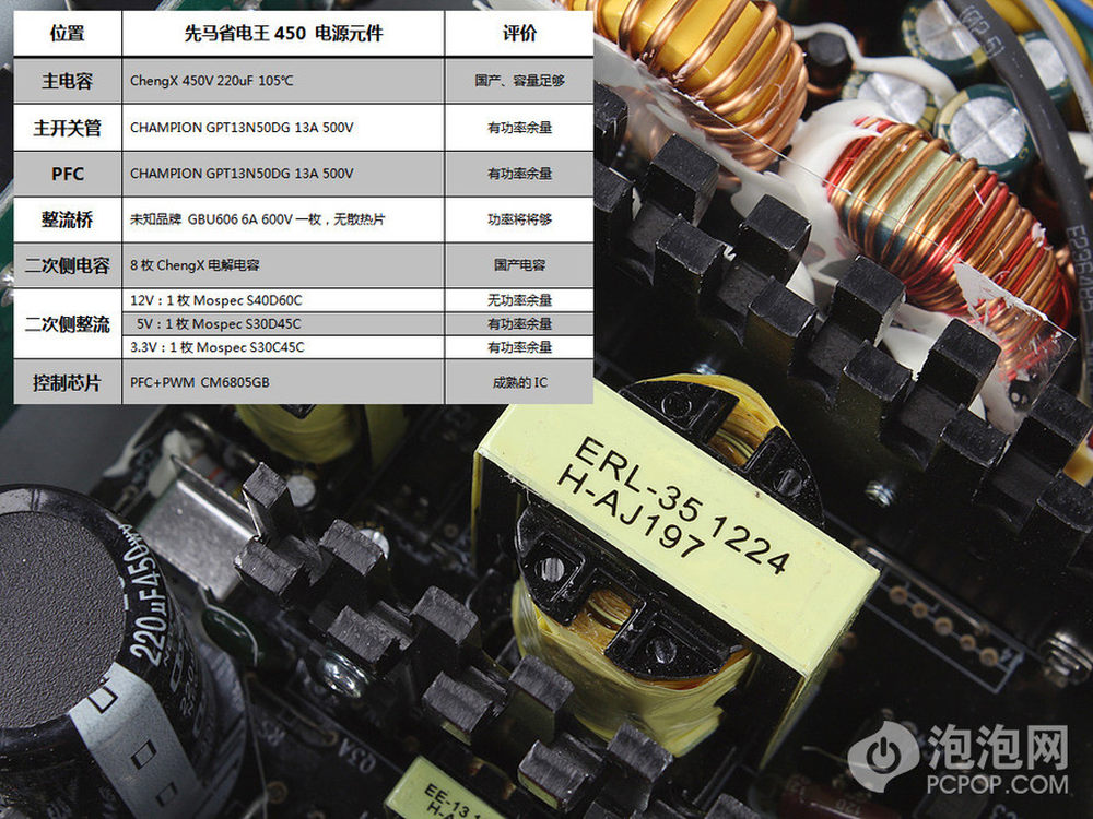 先马省电王450采用了CM6805控制的主动式PFC 双管正激开关,二次侧肖特基整流,其中3.3V单路磁放大。和市面上大部分电源类似。18/21