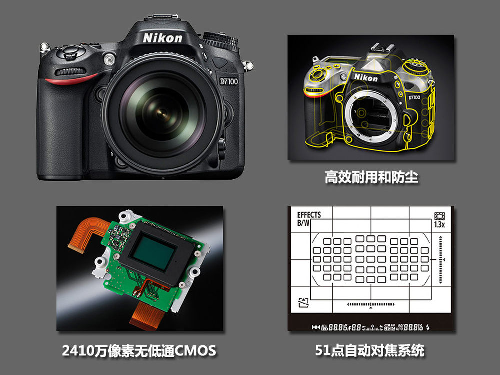 D7100是尼康热卖机型D7000的升级款,不过此次升级幅度十分大,机身上的各种零件都采用与D800和D300s相当的密封处理,可以确保耐蚀和防尘性。内在性能上,不仅达到了2410万有效像素,并且还去除了低通滤镜,可获得更为丰富的影像细节和后期剪裁空间。同时升级为类似D4的51点对焦系统,中心位置还拥有15个十字型感应器,进一步提升了对焦性能。