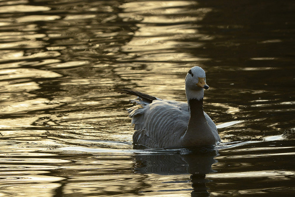 不知不觉已到黄昏,西下的阳光把水面映衬成了一片金色,灰色的大雁正缓缓朝我这边游来,不得不说D7100的宽容度也十分不错。