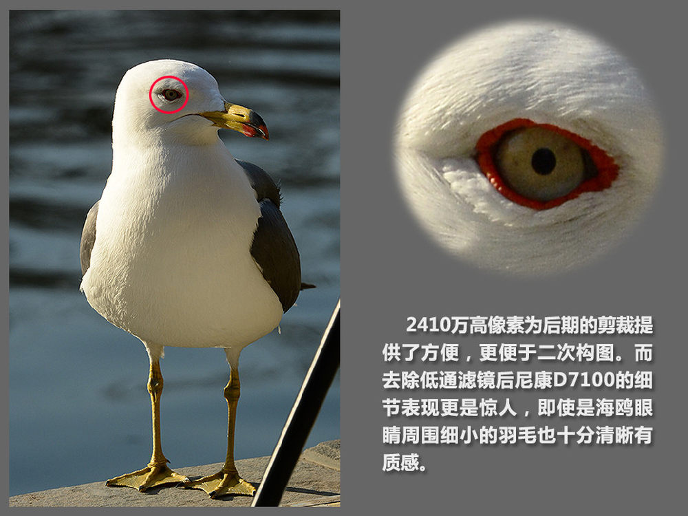 2410万高像素为后期的剪裁提供了方便,更便于二次构图。而去除低通滤镜后D7100的细节表现更是惊人,即使是海鸥眼睛周围细小的羽毛也十分清晰。