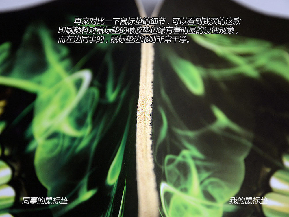 鼠标垫边缘的对比,可以看到,我从论坛上买的这张,在边缘有着明显的浸蚀现象,具体工艺上的优劣我讲不清楚,但是我相信良好工艺的一个最基本特征就是赏心悦目,而我买的这张,显然不是。7/10
