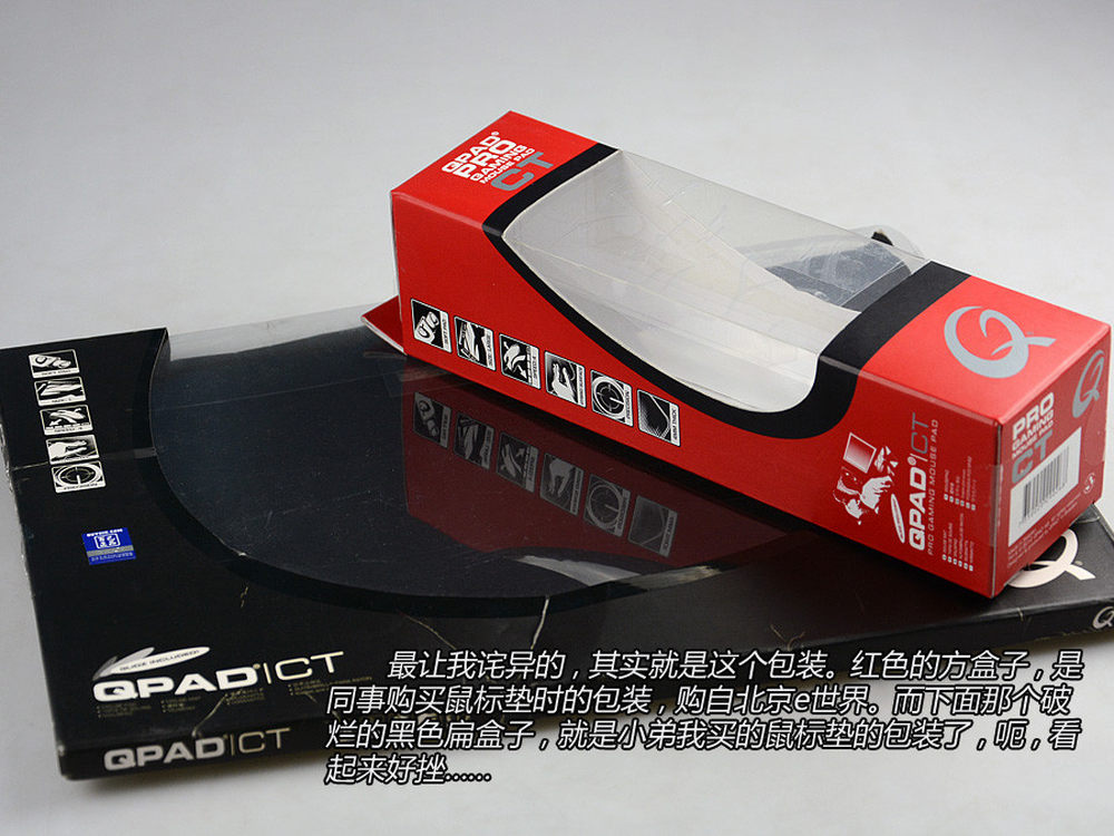 包装上的差异更大,红色的盒子,是同事在北京小凌外设购买的。下面的黑色扁盒子,就是小弟我的鼠标垫包装。这跟红盒子一对比,明显感觉挫了很多。10/10