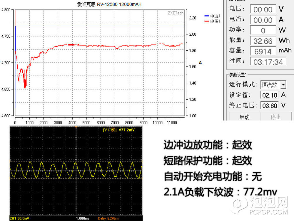 实际放电曲线可见,在2.1A下输出纹波只有77.2mv,还是很不错的表现,虽然没有低于50mv。电源没有自动充电功能,插好线后还需要按一下机身上的按钮才可以开始充电。6/11
