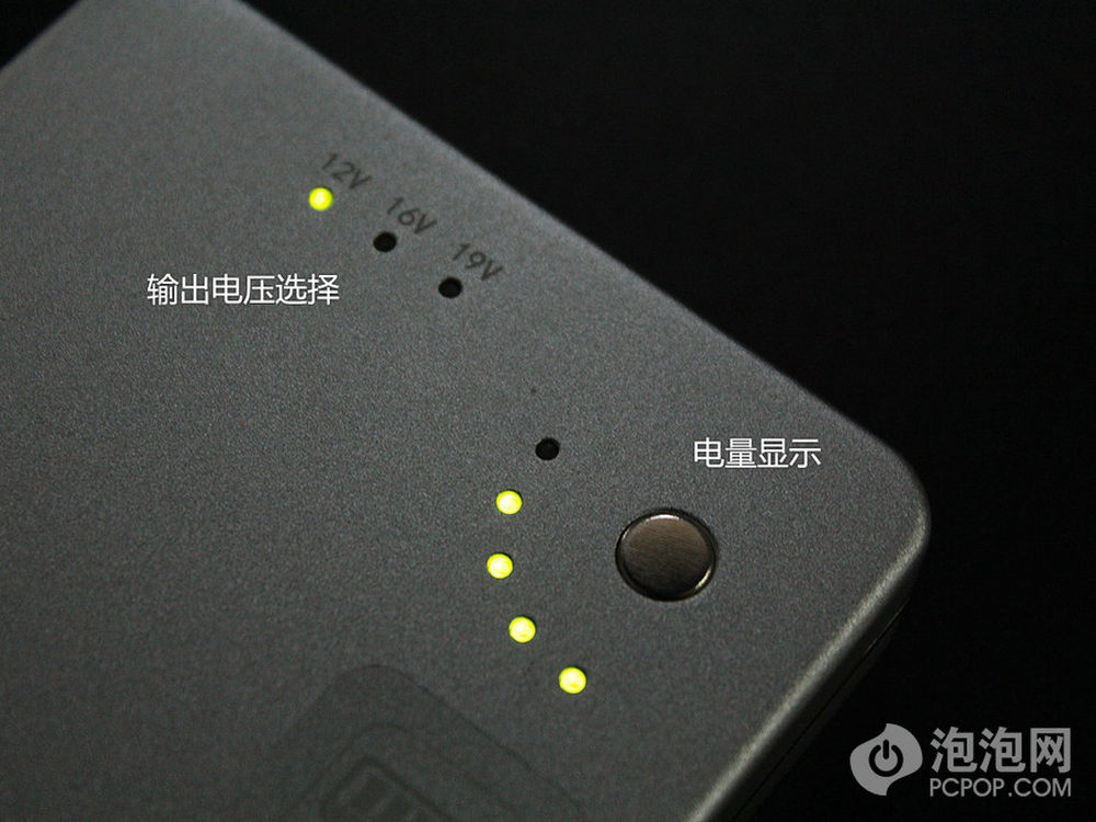 机身正面有LED的显示,电量部分每一个灯代表20%%的电量,电压输出可以在12V、16V、19V选择,可以适应不少笔记本,有些笔记本的输入电压写着18.5V、19.5V、甚至20V的,都可以用19V的适配器,关于这部分的输出我们后面再介绍。8/11