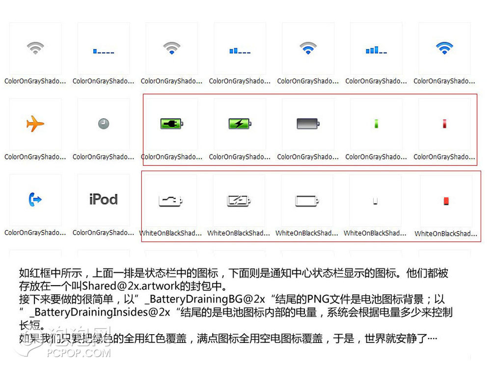 这些电量相关图标都被存放在一个叫Shared@2x.artwork的封包中,以"_BatteryDrainingBG@2x“结尾的PNG文件是电池图标背景;以"_BatteryDrainingInsides@2x“结尾的是电池图标内部的电量。3/8
