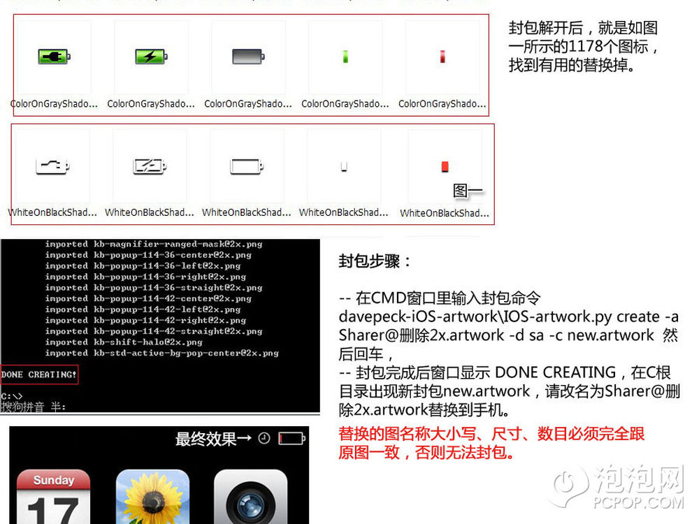 -- 封包完成后窗口显示 DONE CREATING,在C根目录出现新封包new.artwork,请改名为Sharer@删除2x.artwork替换到手机。6/8