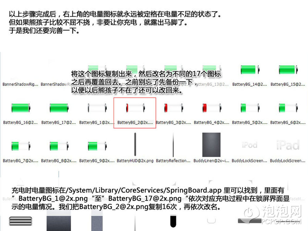 充电时电量图标在/System/Library/CoreServices/SpringBoard.app 里可以找到,里面有”BatteryBG_1@2x.png“至”BatteryBG_17@2x.png“多个图标。依次对应充电过程中在锁屏界面显示的电量情况。我们把BatteryBG_2@2x.png复制16次,再依次改名。7/8