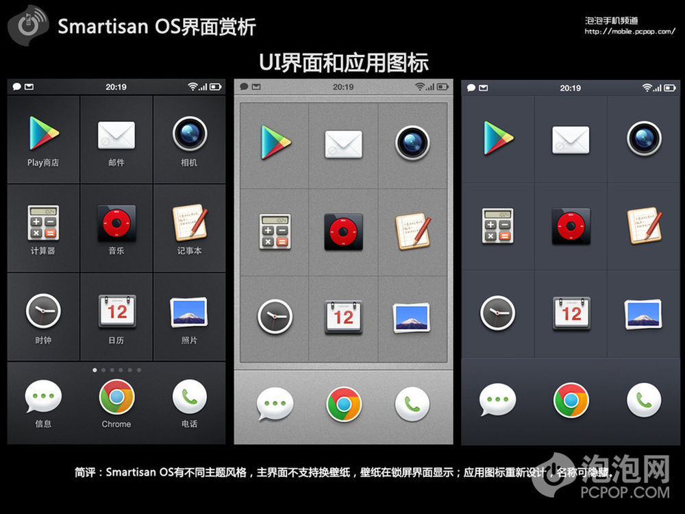 UI界面方面,Smartisan OS拥有不同的主题风格,看上去都是非常素雅的设计。默认并不支持更换桌面壁纸,或者准确说即使更换也没用,也九宫格的设计会阻挡壁纸。系统还为应用程序重新设计了图标方案,应用程序的名字也是可以隐藏的。