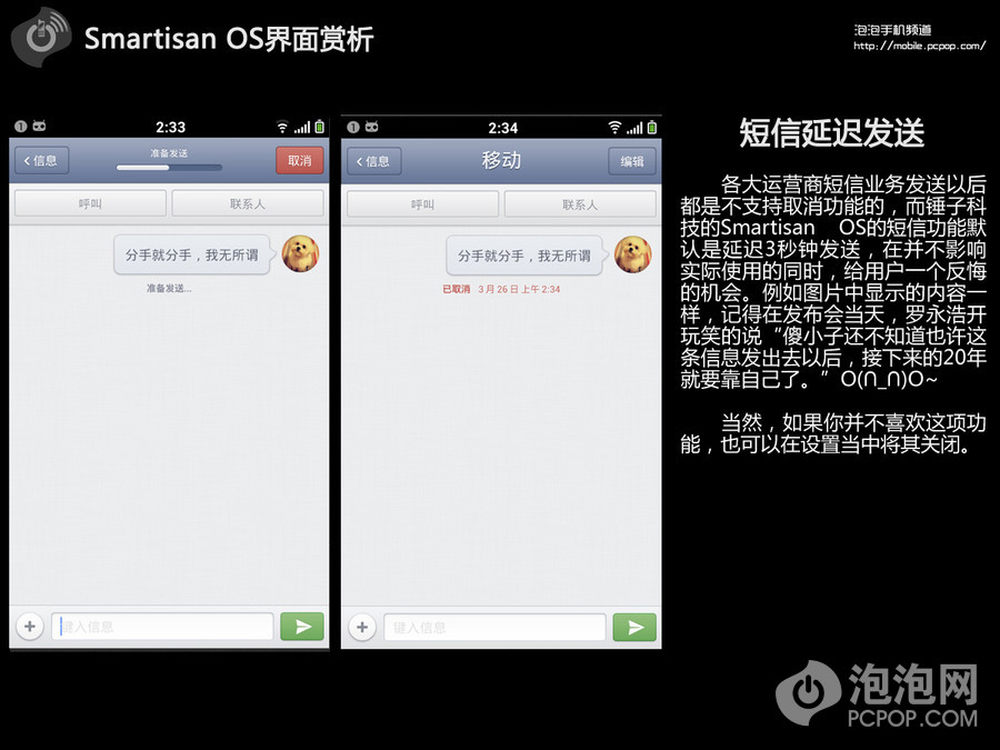 各大运营商短信业务发送以后都是不支持取消功能的,而锤子科技的Smartisan OS的短信功能默认是延迟3秒钟发送,在并不影响实际使用的同时,给用户一个反悔的机会。例如图片中显示的内容一样,记得在发布会当天,罗永浩开玩笑的说“傻小子还不知道也许这条信息发出去以后,接下来的20年就要靠自己了。”O(∩_∩)O~