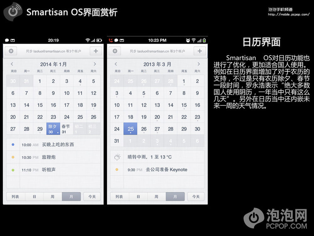 Smartisan OS对日历功能也进行了优化,更加适合国人使用。例如在日历界面增加了对于农历的支持,不过是只有农历除夕、春节一段时间,罗永浩表示“绝大多数国人使用阴历,一年当中只有这么几天”。另外在日历当中还内嵌未来一周的天气情况。