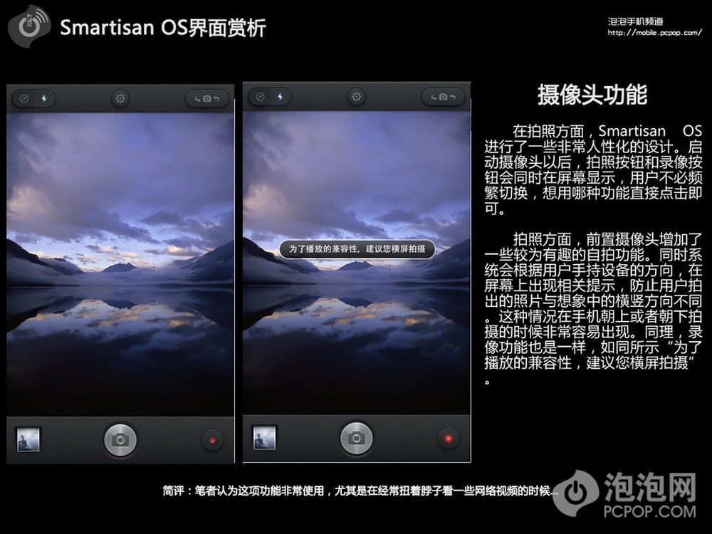 拍照方面,前置摄像头增加了一些较为有趣的自拍功能。同时系统会根据用户手持设备的方向,在屏幕上出现相关提示,防止用户拍出的照片与想象中的横竖方向不同。这种情况在手机朝上或者朝下拍摄的时候非常容易出现。同理,录像功能也是一样,如同所示“为了播放的兼容性,建议您横屏拍摄”。