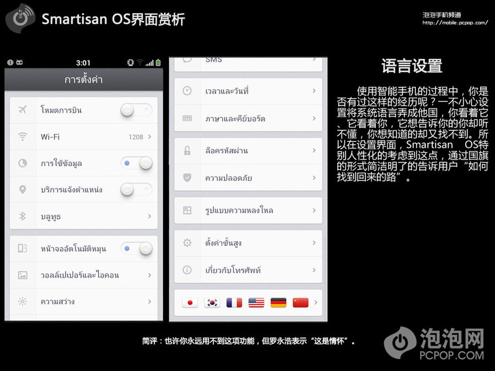 使用智能手机的过程中,你是否有过这样的经历呢?一不小心设置将系统语言弄成他国,你看着它、它看着你,它想告诉你的你却听不懂,你想知道的却又找不到。所以在设置界面,Smartisan OS特别人性化的考虑到这点,通过国旗的形式简洁明了的告诉用户“如何找到回来的路”。