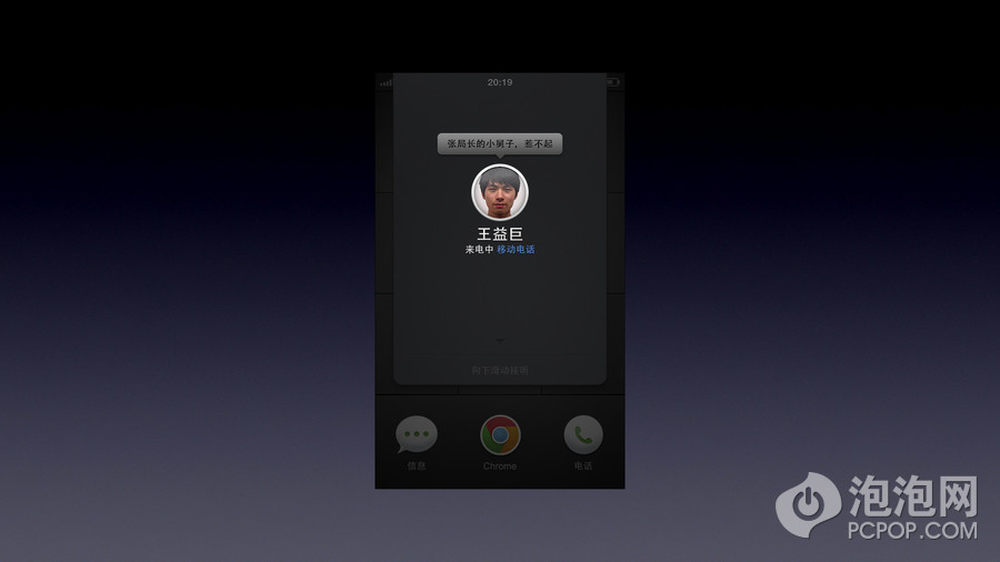 来电界面,可以显示对联系人简短的描述。假如你的联系人有成百上千人,这项功能就非常实用了,简短的描述可以帮助机主很快想起来电用户到底是谁。另外向下滑动为接听,向上滑动为拒绝接听。