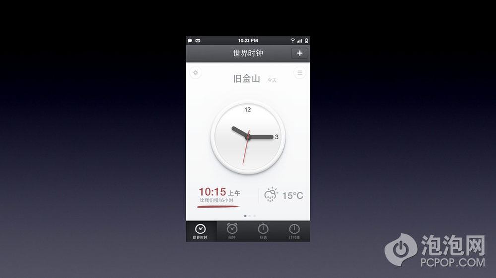 世界时钟界面,左下角会显示与本地时间的时差,右下角就会显示天气状况,都是非常简单但又很人性化的设计。
