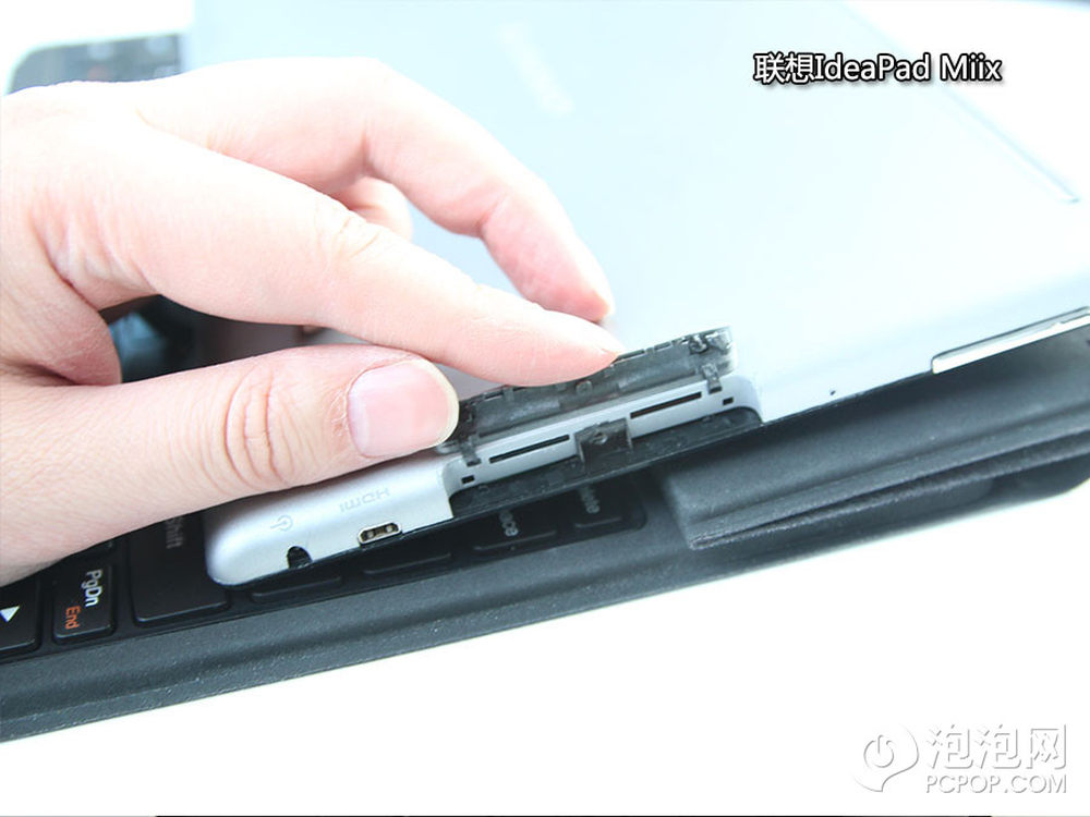 与保护套相连的接口。从保护套设计的方式来看,联想应该是希望用户一直套着它使用。保护套和平板连接的是三个卡口,固定很牢固,不像是可以经常拆卸的样子。12/19