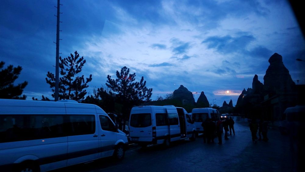 由于要乘坐热气球观看日出,所以起了一个大早。热气球公司派车前来旅馆接客人,笔者在车内拍摄了一张太阳还未升起时候的照片,为了记录下这难得的早起。