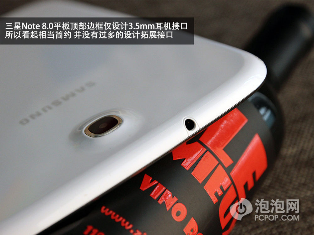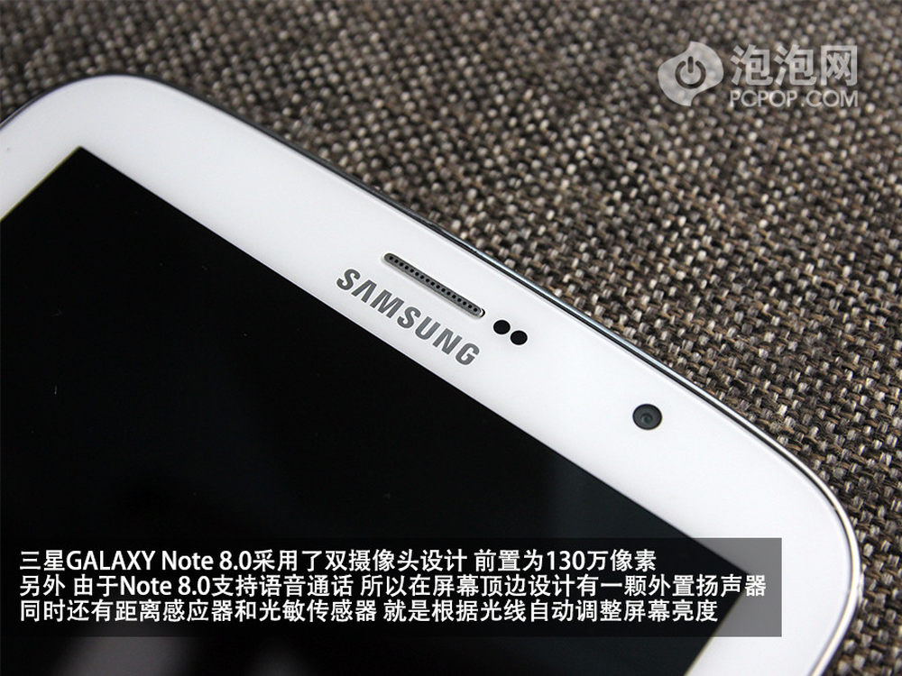 三星GALAXY Note 8.0前置面板顶边的摄像头、距离感应器以及外置扬声器设计。