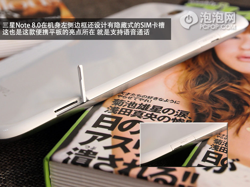 Note 8.0支持语音通话,隐藏式的SIM卡槽特写。