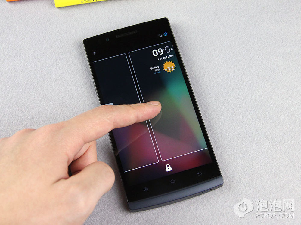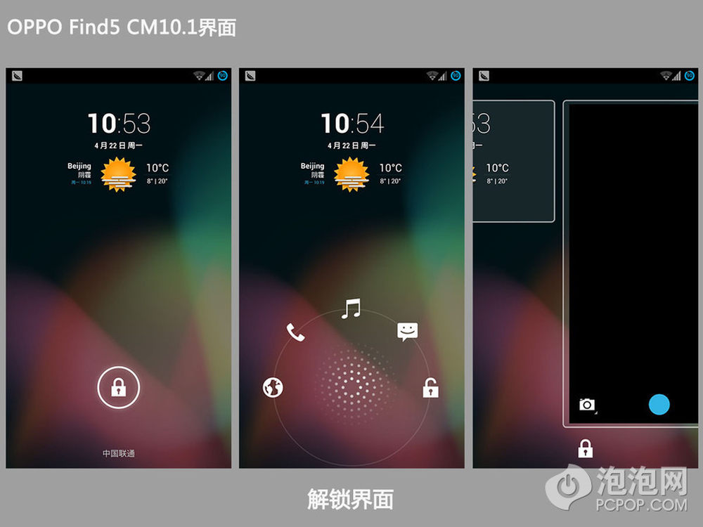 CM系统的解锁界面与原生系统相似,通过滑动解锁图标来进行解锁。Find5官方固件从屏幕左右两侧任意向一端滑动都可以解锁。