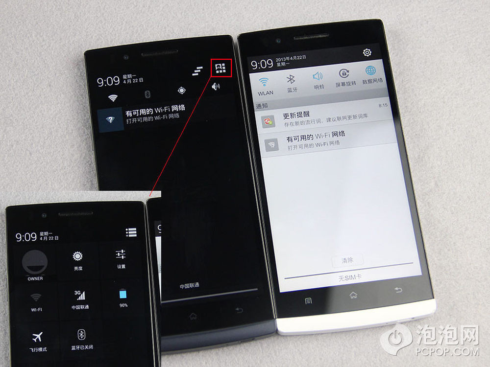 CM10.1的下拉通知菜单可以切换到快捷设置界面,而OPPO Find5则是将设置界面集成在通知菜单中。