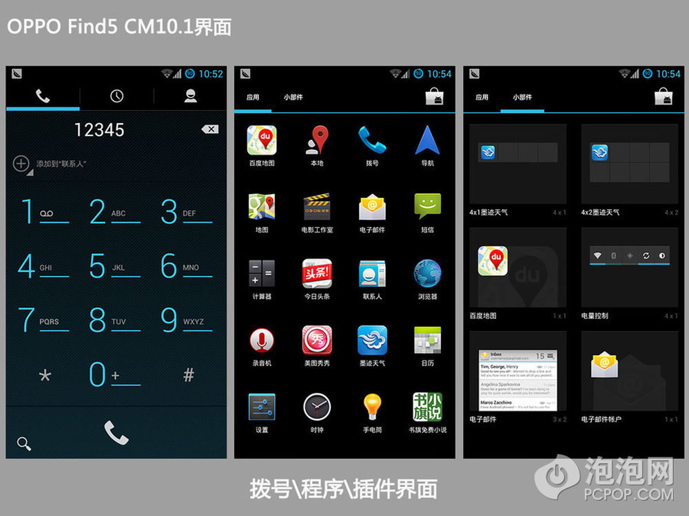 CM10.1的小插件界面与原生Android系统相同,可以通过切换程序菜单标签栏来查看。OPPO官方查看小插件是在主屏中长按屏幕,除了添加小插件,还可以更换壁纸。