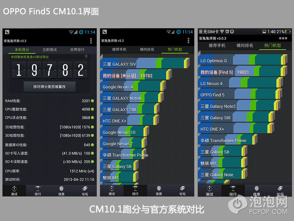 在性能方面,由于CM10.1精简了系统应用,固件的大小仅为OPPO官方的四分之一左右,性能上会有一定的提升,从测试结果看,刷完CM10.1后OPPO Find5的最终得分为19782,而官方跑分为19021,有小幅提升,但是可以忽略不计。
