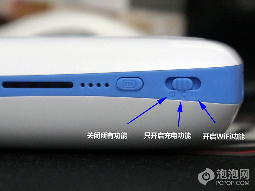 功能开关档位有3档,已经在图中标明了解释,个人感觉这一点在设计中还有改进空间,因为一般人不太愿意看说明书,也不知道这几个档位是做什么用的,尤其是当他不理解雷凌RT5350处理器待机功耗较高,所以不需要无线功能时最好把档位拨到C来给移动电源充电这个道理。8/17