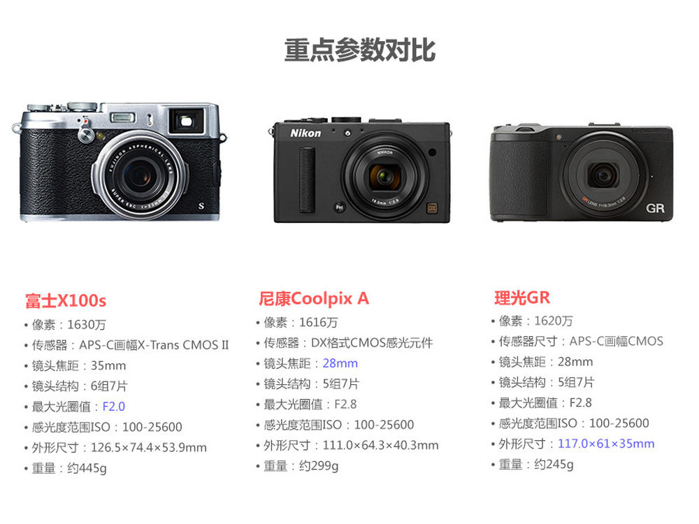 三款相机都使用了APS-C画幅传感器,并且都为无低通设计,能获得更好的细节,使画面更加锐利。富士X100s外形偏复古风格,尼康Coolpix A则像放大版的P310,而理光GR则是其中最轻最小的一款。