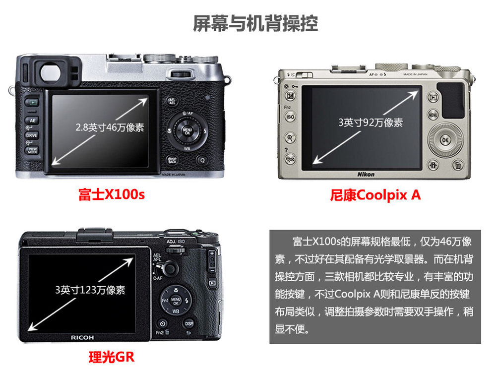 富士X100s的屏幕规格最低,仅为46万像素,不过好在其配备有光学取景器。而在机背操控方面,三款相机都比较专业,有丰富的功能按键,不过Coolpix A则和尼康单反的按键布局类似,调整拍摄参数时需要双手操作,稍显不便。