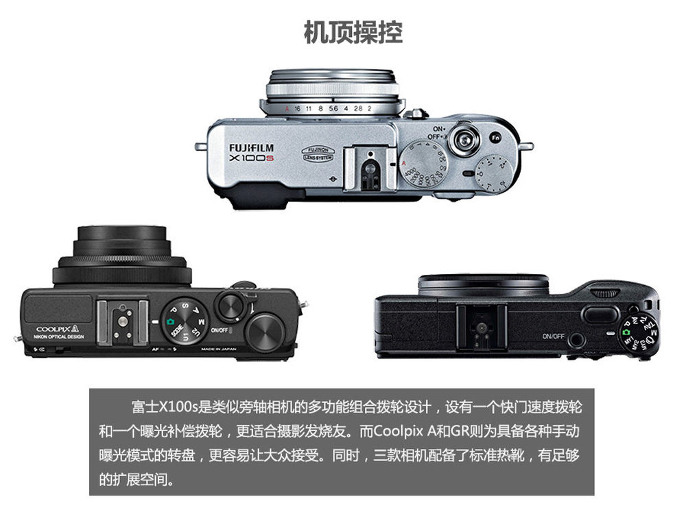 富士X100s是类似旁轴相机的多功能组合拨轮设计,设有一个快门速度拨轮和一个曝光补偿拨轮,更适合摄影发烧友。而Coolpix A和GR则为具备各种手动曝光模式的转盘,更容易让大众接受。同时,三款相机配备了标准热靴,有足够的扩展空间。