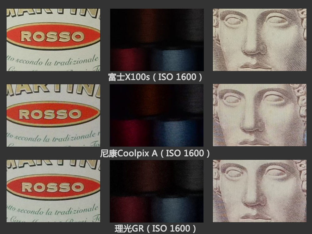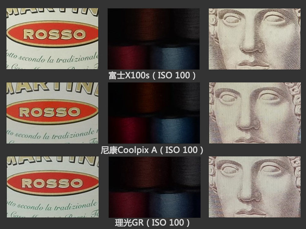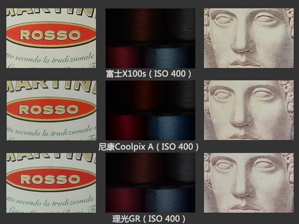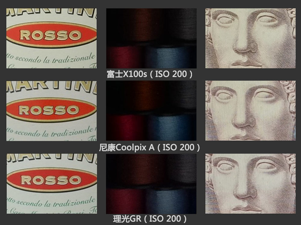 X100s和Coolpix A以及GR都采用的是APS-C画幅传感器,那么下面就来对比下三款相机的画质吧,红色方框内为截取范围。