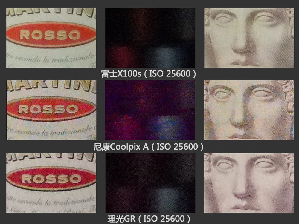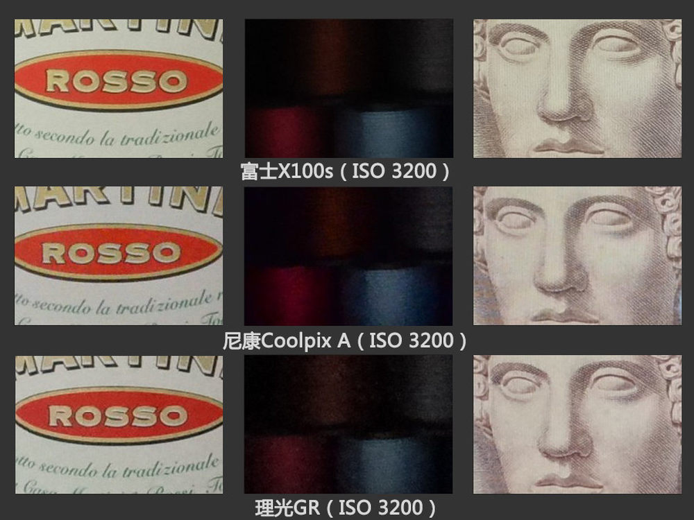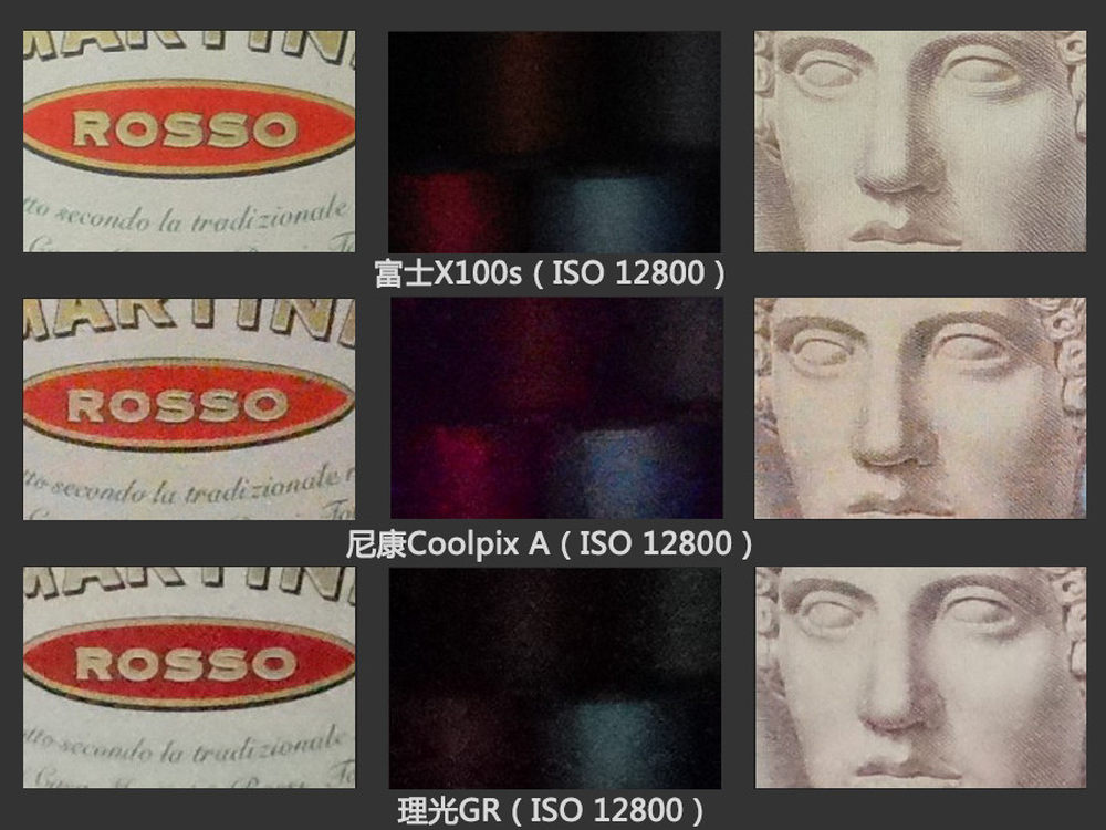 从以上各档ISO的对比可以看到,虽然三款相机都是APS-C画幅并且均无低通滤镜,但富士X100s无论是高感控噪能力还是细节表现都最好,X-Trans CMOS II传感器的实力不容小觑。而Coolpix A和GR在低感时画质相当,当感光度达到ISO 1600以上后,个人认为理光GR表现更为出色,让人诧异的是,在ISO 12800-25600的极限高感下,Coolpix A甚至出现了明显的偏色现象。