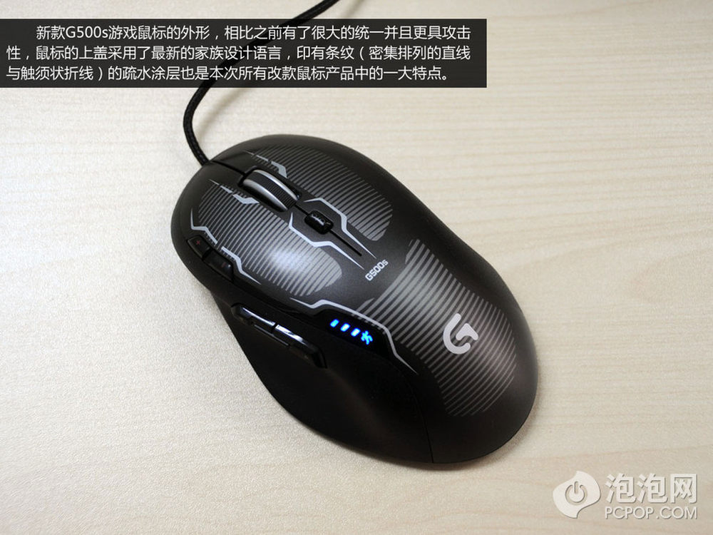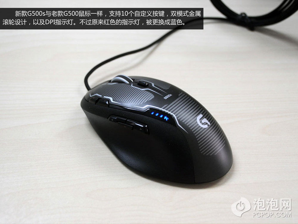 新款G500s鼠标同样支持10个自定义按键,支持双模式金属滚轮设计,以及DPI灯光指示。不过老款G500的DPI指示灯为红色,而新款G500s的指示灯为蓝色,则更加具有科技感。6/8