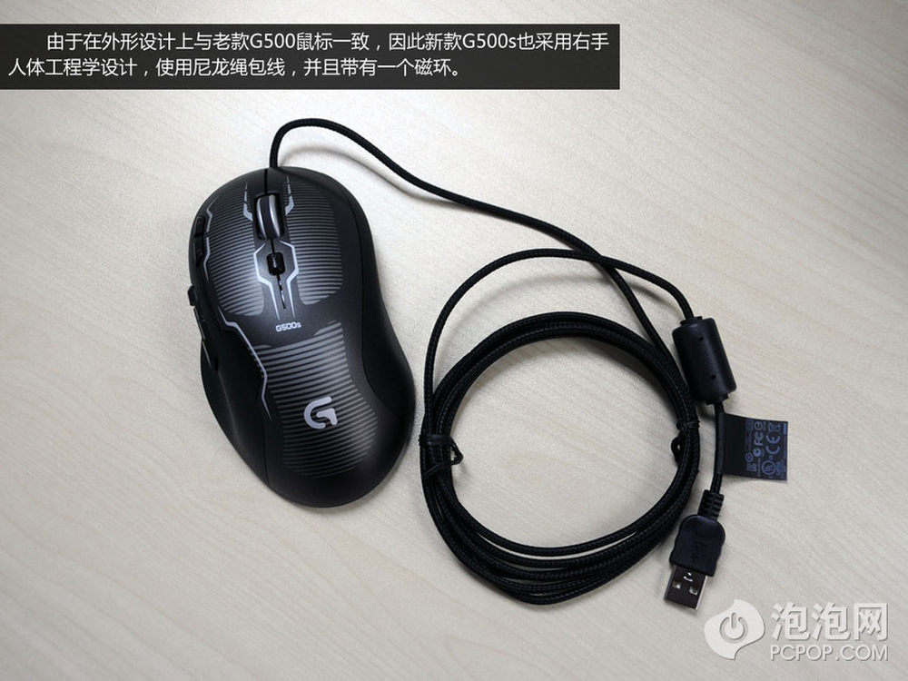 新款G500s鼠标也采用尼龙绳包线,并且带有一个磁环设计。另外,我们也能看出来,鼠标背部的条文设计,更加有冲击性。5/8